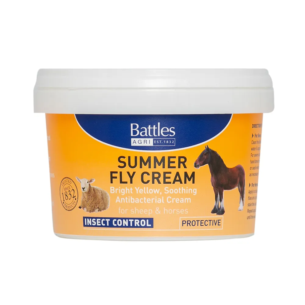 Battles Summer Fly Cream 400g is a thick, soothing barrier cream designed to protect horses and livestock from flies, midges, and biting insects during warm weather. Its long-lasting formula adheres well to the skin — ideal for use on sensitive areas such as heels, teats, ears, and tails — helping to prevent irritation and keep animals comfortable throughout the summer months.