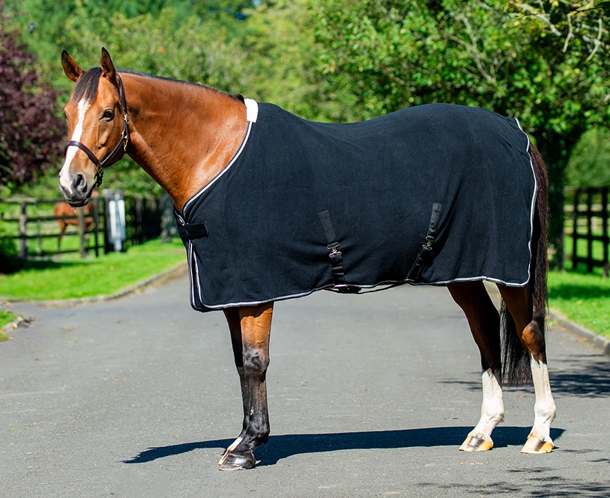The Equisential Fleece Cooler features a male/female front fastening, cross surcingles, and a fillet string for a secure, adjustable fit that stays comfortably in place. Its sleek black and silver colour combination offers a professional and elegant look, ideal for both home and show use.