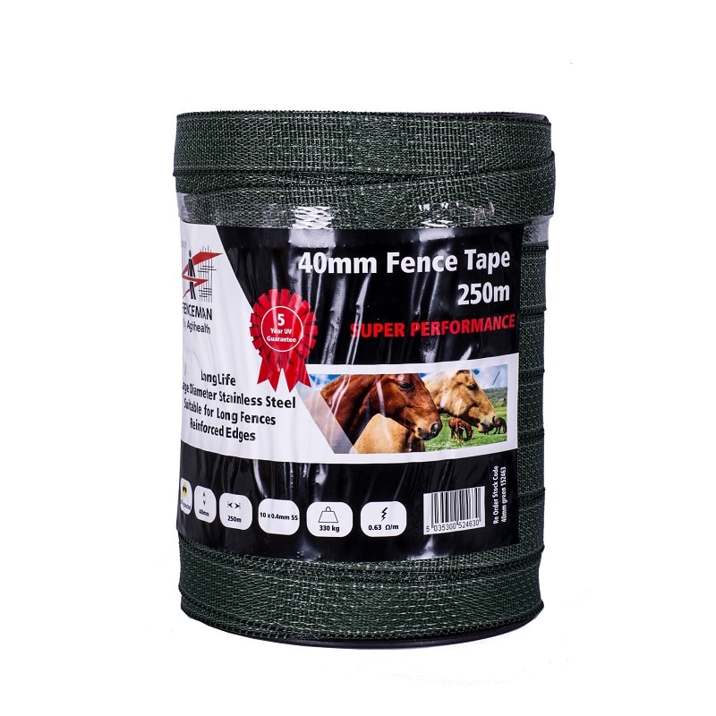 The Fenceman 40mm Super Performance Tape 250m is a heavy-duty electric fencing tape designed for large fences and long perimeter runs where strength, visibility, and consistent conductivity are essential. Wider fencing tape provides a strong visual barrier, helping livestock clearly recognise boundaries and reducing fence challenges.