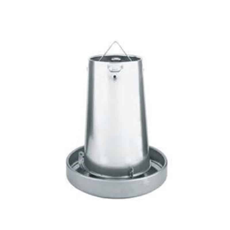 Poultry hopper feeder made entirely of galvanised steel with a handle for hanging and easy transportation of food.