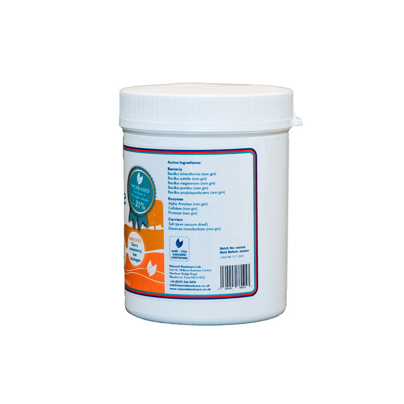 Slurrycare from Natural Stockcare is a slurry additive designed to increase the bacteria level of the slurry. It helps reduce “crust” formation and keep the slurry in an easy to spread liquid form. Slurrycare is a management tool designed to reduce costs and enhance the fertilising qualities of slurry. The complex of fibre-digesting bacteria and enzymes makes Slurrycare suitable for all slurry stores, pits and slatted buildings, ensuring that the resulting liquid is always ready for spreading. Slurrycare reduces both labour and diesel costs, and saves time by removing the need for prolonged agitation.